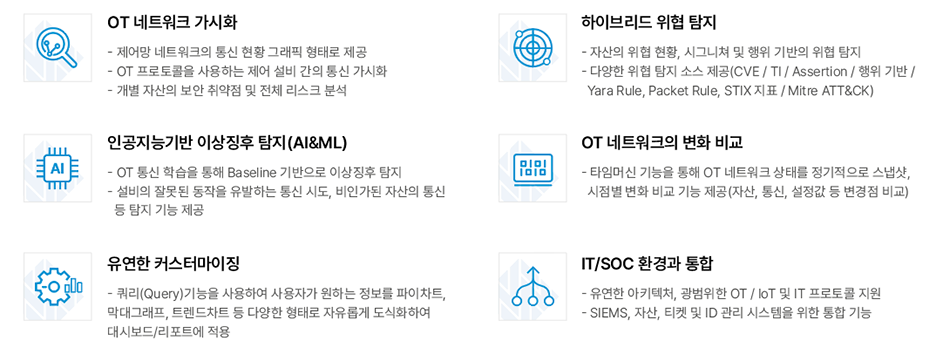 IT, OT 및 IoT 영역에서 혁신적인 인공지능 기술을 기반으로 산업제어 네트워크의 자산 현황 파악, 데이터 시각화 및 모니터링 등의 어려운 작업을 자동화하는 솔루션입니다.