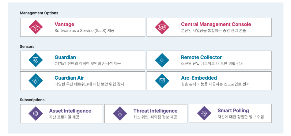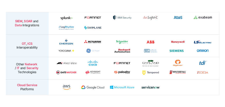 주요시설, 에너지, 제조, 광업, 운송, 스마트 빌딩 및 기타 OT 현장에 사이버 보안 데이터를 통합하여 디지털 혁신을 가속화하고 OT/ICS 영역의 사이버 보안을 넘어 자산관리 및 유지보수 작업예측 등의 서비스로 경영 효율성 향상을 지원합니다.